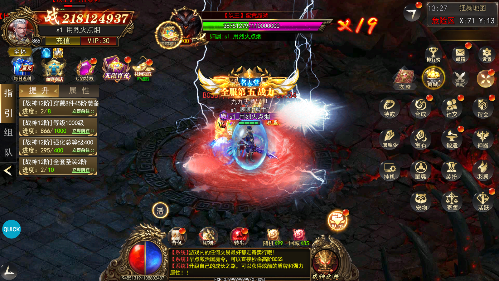 《烈火战神:无限直充》是一款单职业传奇。打BOSS不仅可以获取大量的充值点,更有0氪冲满V。玩法丰富刺激,一刀斩神荒,上线送真充,秒怪也轻松。